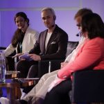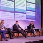 Yhdessä kohti reaaliaikaista datataloutta. Keijo Kettunen (vas.), Franck Mertens ja Sanna Esterinen kertoivat RTE-hankkeesta. Esiintyjiä tenttasi Tiedolla-salin moderaattori Meri Ruuskanen.